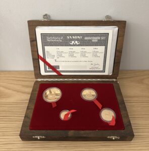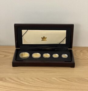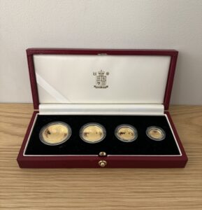 Et sett med Britannia 22 karat gold proof samlemynter fra 1998 i størrelsene 1 oz, 1/2 oz, 1/4 oz, 1/10 oz.