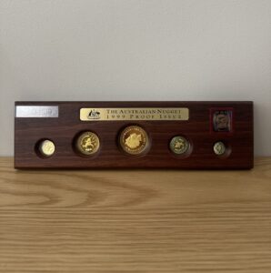 Et sett med Australian Nugget 1999 Proof Issue mynter i størrelsene 1 oz, 1/2 oz, 1/4 oz, 1/10 oz og 1/20 oz.