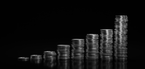Stablede sølvmynter i stigende høydeformasjon mot svart bakgrunn, som illustrerer vekst og diversifisering i en investeringsportefølje.