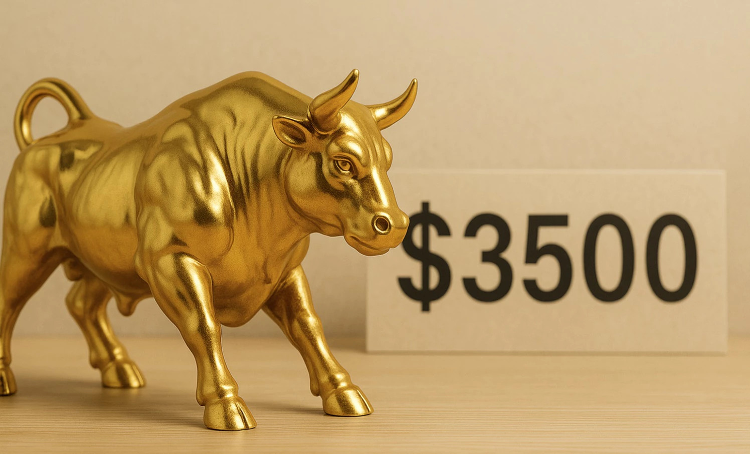 Gull har passert 3500 dollar. Bildet viser okse i gull foran teksten "3500 $"